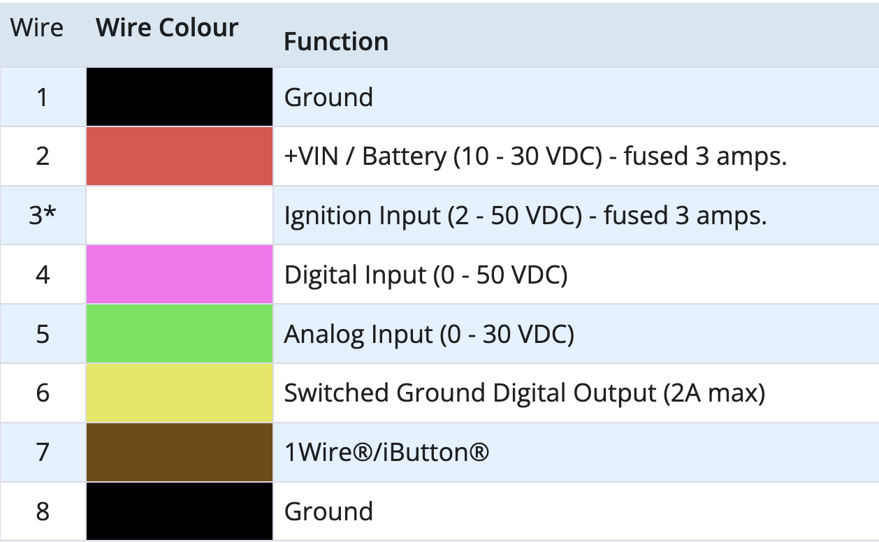 - The White ignition input will register as 'on' when >2 VDC is applied to this line.